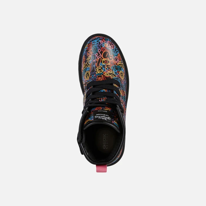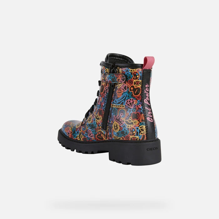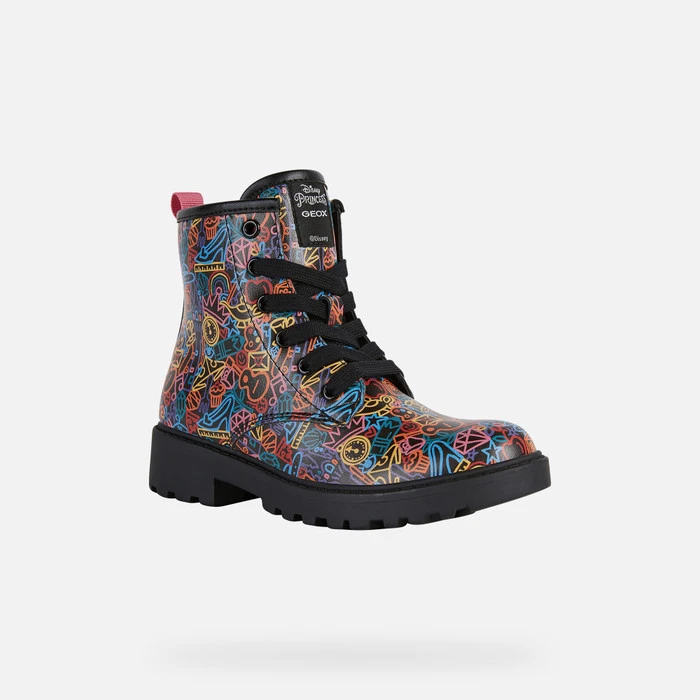 Girl’s lace-up ankle boot dedicated to Disney Princesses. A product of the partnership between Geox and Disney, Casey has been made from a leather-effect material with a black-and-multicolored print pattern. Comfortable and breathable, it has a romantic glamorous aesthetic for fashion-conscious little dreamers.