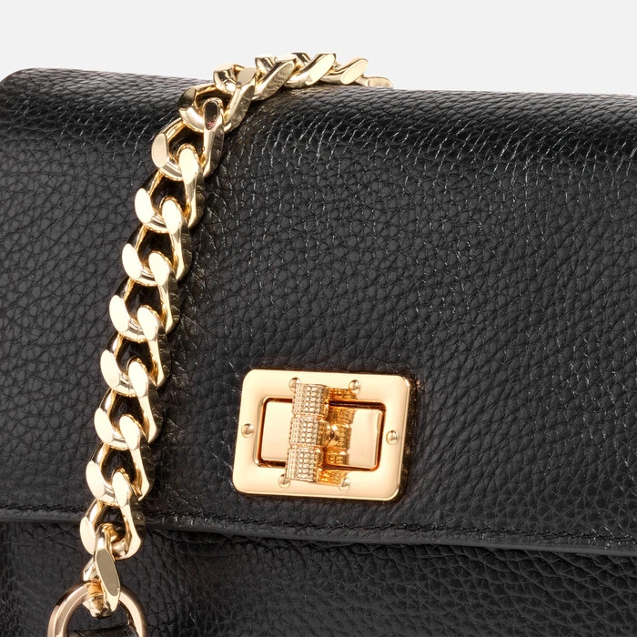 - Leather shoulder strap and slender metallic chain with an adjustable and removable design.