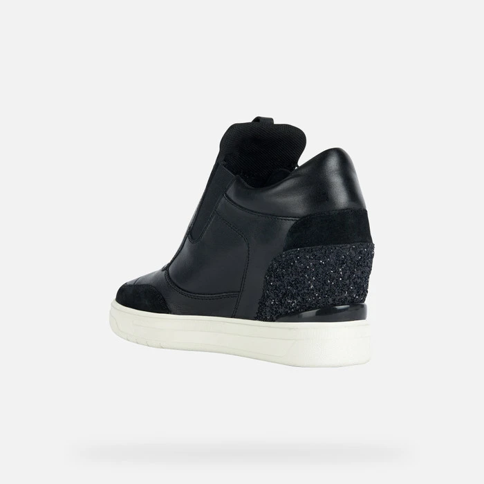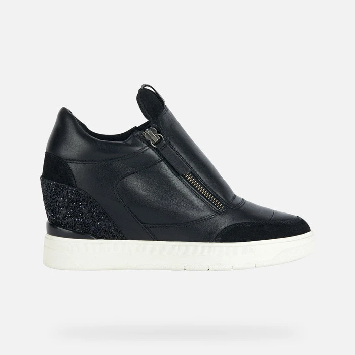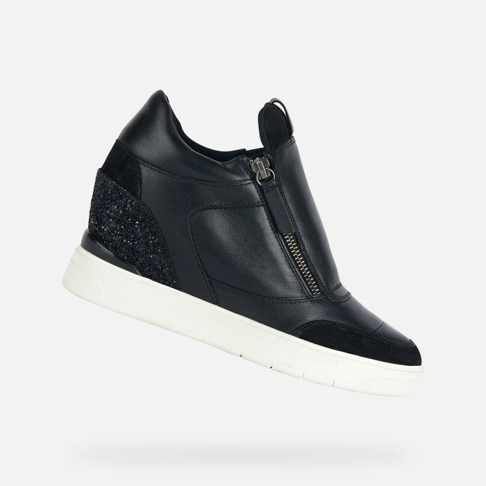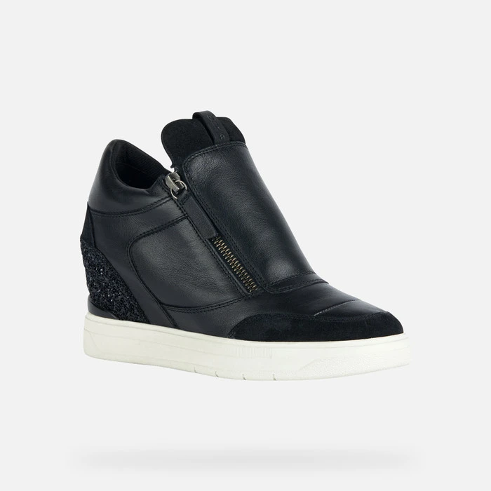 Women’s sneaker featuring an internal wedge, a practical side-zipper closure and a comfortable breathable design. This attractive version has been made from a mixture of supple nappa and suede in a bold black palette with a tonal glitter detail. The perfect complement to characterful leisuretime looks, Maurica stands apart for a running-shoe aesthetic which brings to the fore its sleek contemporary silhouette.