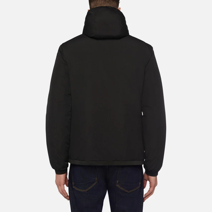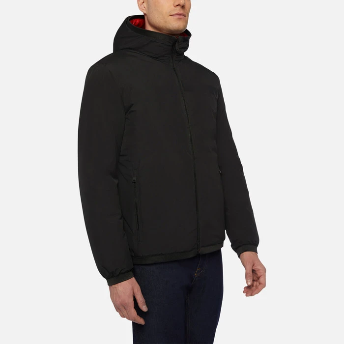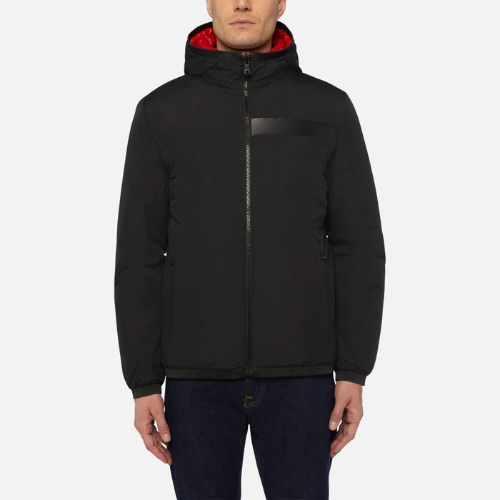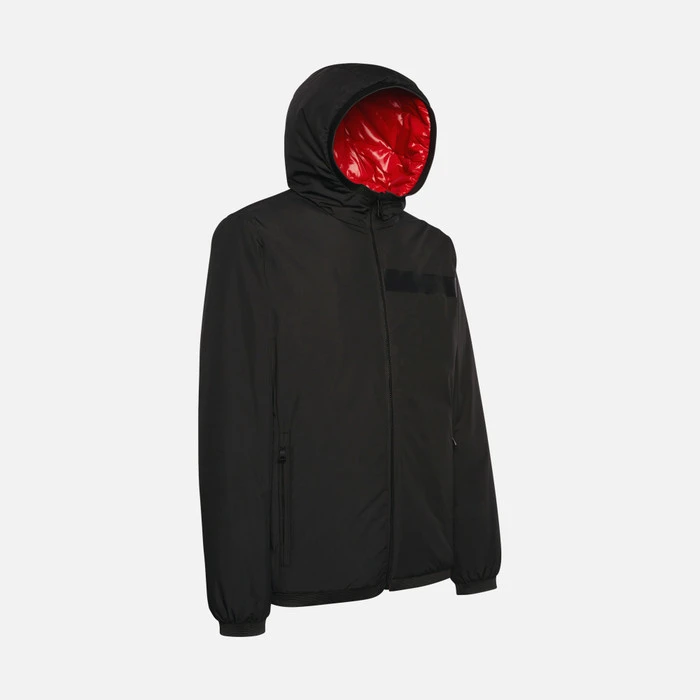 Short reversible hooded parka jacket for men with a medium weight and a sporty vibe. This double-face garment not only comes in two different colors, it also features two different fabrics. One side has been made from matte black polyester with a water-resistant windproof finish while the other is in quilted 20-denier nylon in a shiny red palette. With a reflective tonal detail at the front, Renan is a streetwise jacket that will be ideal for anyone with an active lifestyle.
