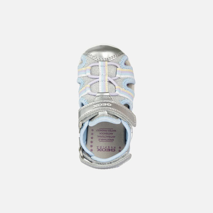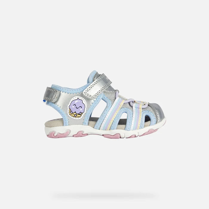 Girl’s sporty casual-looking water-resistant sandal with a practical adjustable hook-and-loop closure. Crafted from a pearlescent leather-effect material and shiny mesh in a silver shade, Flaffee features a semi-closed upper embellished with summery print designs and outdoor-inspired detailing. This flexible breathable piece of footwear has a toe guard that protects against jolts and knocks and rests on a gripping outsole that will be effective on slippery ground too.
