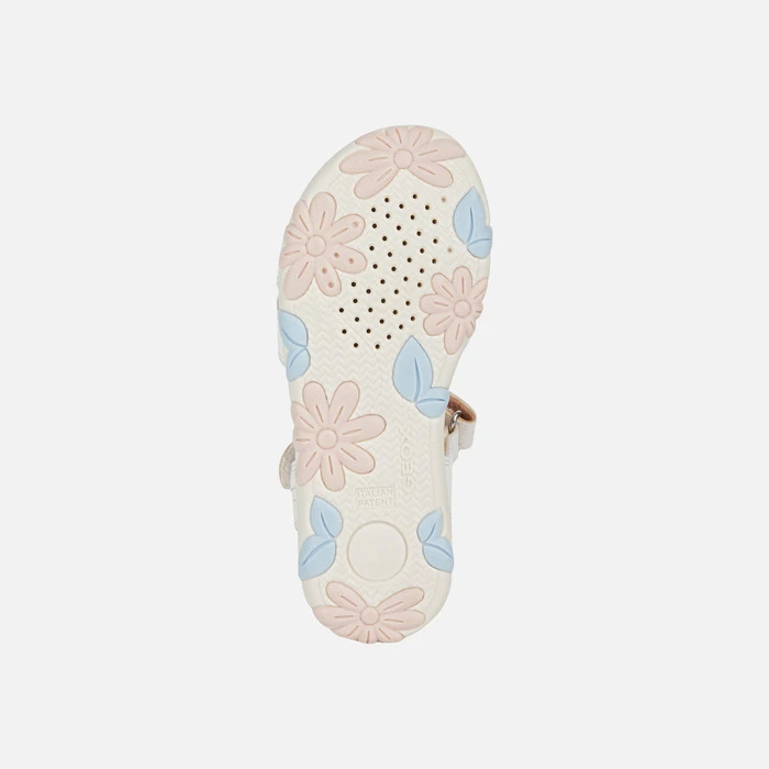 Girl’s comfortable breathable sandal with an energetic feel and feminine aesthetic. Rendered in a demure white and pale-pink colorway, it has an upper made from a leather-effect material decorated with pretty romantic flowers. Haiti has a practical hook-and-loop closure that makes for an easy foot entry and effortless day-to-day use.