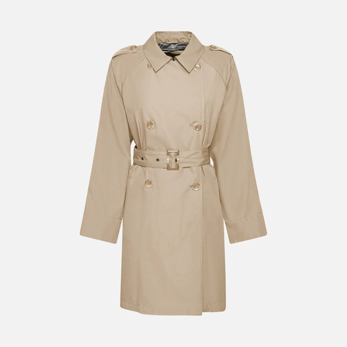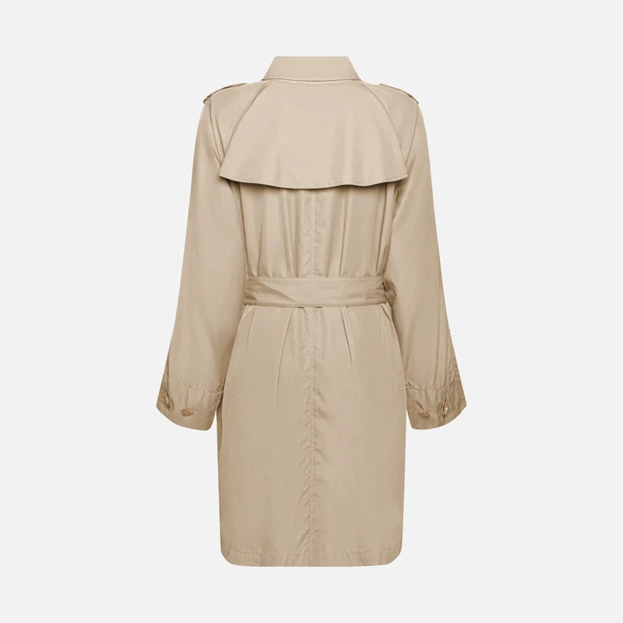 Longline trench coat for women with kimono sleeves and a laid-back refined aesthetic. This timelessly classic beige version has been made from matte polyester with a water-resistant windblocking finish. A perfect solution on cooler days when there is a chill in the air, Soleil is an ultra-lightweight piece of everyday outerwear that will be ideal for around town and leisuretime occasions alike.